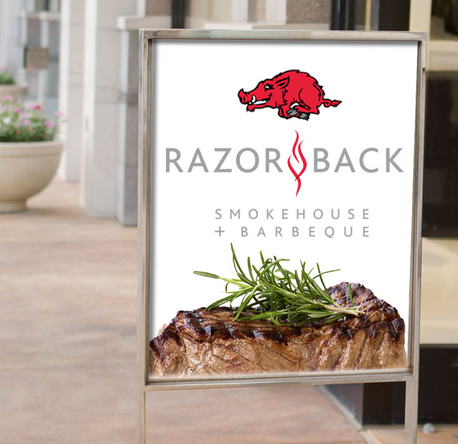Razorback Smokehouse + Barbeque, is an upscale bistro style restaurant that uses traditional cooking techniques to make deliciously smoked southern food. Using a friendly illustration of a Razorback wild boar as well as incorporating a stylized flame, we built an identity that emphasizes the BBQ offering and fun atmosphere. Coupled with a clean, modern font, the identity coveys an appealing message to any truly refined foodie.